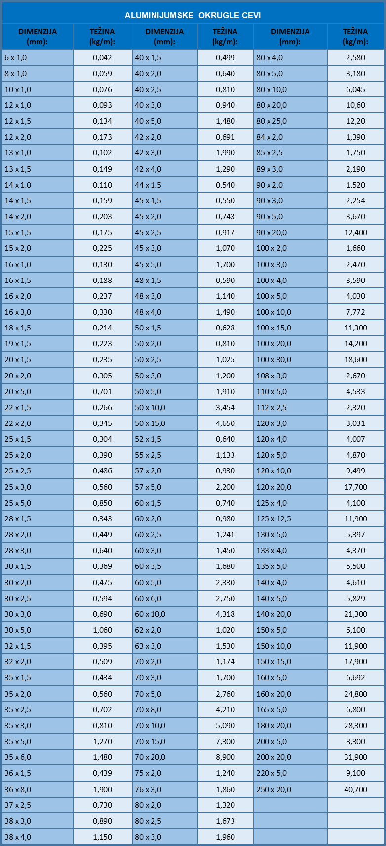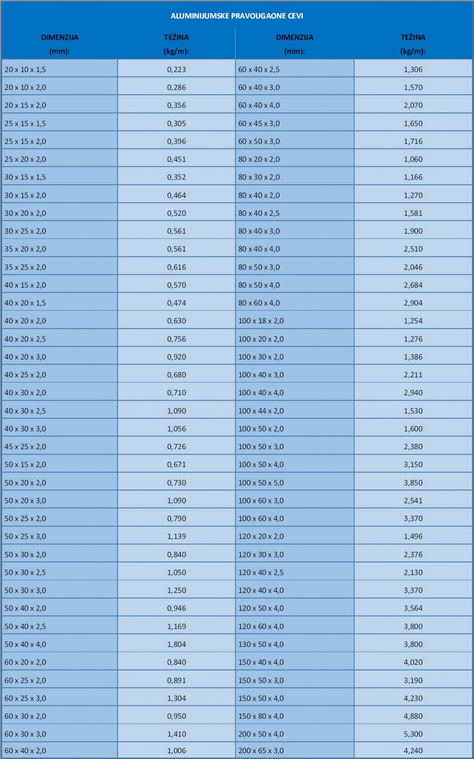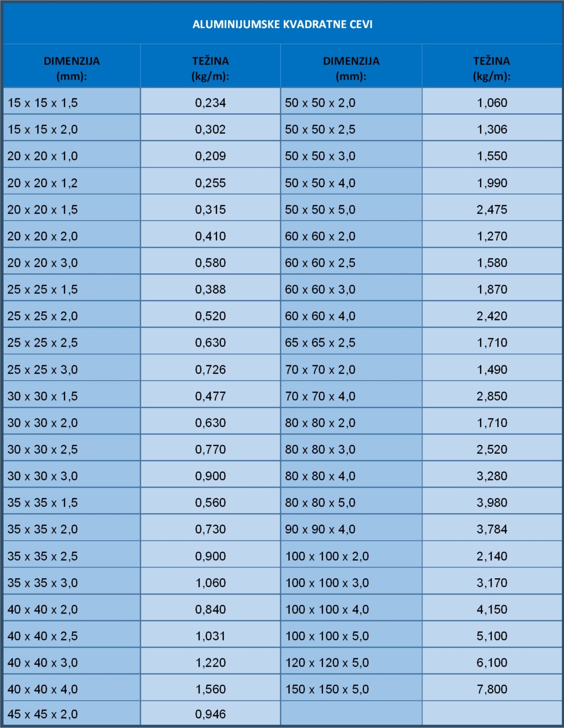 Kod nas možete pronaći kvadratne, pravougaone i okrugle aluminijumske cevi raznih dimenzija. Veliki asortiman držimo na lageru i isporuka je moguća odmah. Više slika našeg asortimana aluminijumskih cevi možete pogledati u galeriji.